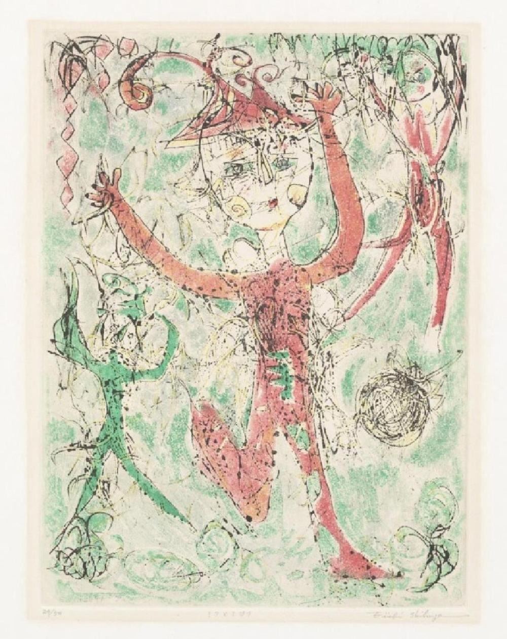 A Japanese modern woodblock prints. Eiichi, Shibuya (Japan, 1928-2011). Depicting running kids with hands up. 24/50. Numbered, titled and signed in pencil along the lower edge. 14 3/4"h x 11"w.Provenance: From the collection of diplomat T. Kobayashi. FINE CONDITION