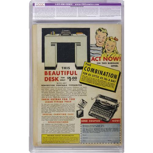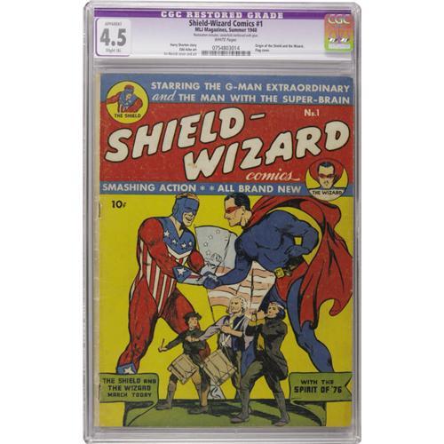 <B>Shield-Wizard Comics #1 (MLJ, 1940) CGC Apparent VG+ 4.5 Slight (A) Off-white pages.</B></I> The first detailed telling of the Shield's origin is found in this issue - previously, all readers had were brief summaries of the origin in captions of the Shield's <B>Pep Comics</B></I> adventures. The Wizard's origin is recounted here as well. Irv Novick drew the great flag cover as well as the Shield stories; the Wizard's tales were drawn by Edd Ashe. CGC notes, "Restoration includes: centerfold reinforced with glue." Overstreet 2006 GD 2.0 value = $485; VG 4.0 value = $970.<BR><BR><b>Shipping:</b> Slabbed Comic (<a target="_blank" href="http://www.heritageauctions.com/common/shipping.php">view shipping information</a>)
