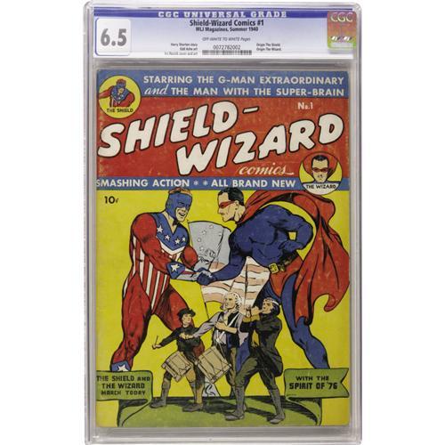 <B>Shield-Wizard Comics #1 (MLJ, 1940) CGC FN+ 6.5 Off-white to white pages.</B></I> This issue's got the origins of both the Shield and the Wizard. The flag cover is by one of comics' most prolific -- and enduring -- artists, Irv Novick, who also worked on the story art, along with Edd Ashe Jr. Overstreet 2006 FN 6.0 value = $1,455; VF 8.0 value = $3,395. CGC census 12/06: 1 in 6.5, 7 higher.<BR><BR><b>Shipping:</b> Slabbed Comic (<a target="_blank" href="http://www.heritageauctions.com/common/shipping.php">view shipping information</a>)