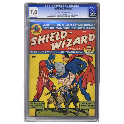 <B>Shield-Wizard Comics #1 (MLJ, 1940) CGC FN/VF 7.0 Cream to off-white pages.</B></I> This copy would no doubt have graded out much higher if not for some smudging issues on the back cover -- it looks great from the front. The flag cover by Irv Novick certainly looks fantastic. The origins of both the Shield and the Wizard are recapped in the issue. Overstreet 2006 FN 6.0 value = $1,455; VF 8.0 value = $3,395. CGC census 3/06: 3 in 7.0, 4 higher.