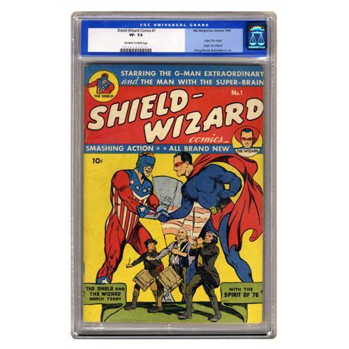 <B>Shield-Wizard Comics #1 (MLJ, 1940) CGC VF- 7.5 Off-white to white pages.</B></I> The first detailed telling of the Shield's origin is found in this issue -- previously, all readers had were brief summaries of the origin in captions of the Shield's <B>Pep Comics</B></I> adventures. The Wizard's origin is recounted here as well. Irv Novick drew the great flag cover as well as the Shield stories; the Wizard's tales were drawn by Edd Ashe. Overstreet 2005 VF 8.0 value = $3,388. CGC census 12/05: 1 in 7.5, 3 higher.