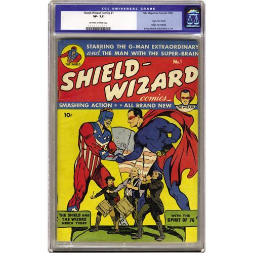 <B>Shield-Wizard Comics #1 (MLJ, 1940) CGC VF- 7.5 Off-white to white pages.</B></I> The first detailed telling of the Shield's origin is found in this issue - previously, all readers had were brief summaries of the origin in captions of the Shield's <B>Pep Comics</B></I> adventures. The Wizard's origin is recounted here as well. Irv Novick drew the great flag cover as well as the Shield stories; the Wizard's tales were drawn by Edd Ashe. Overstreet 2006 VF 8.0 value = $3,395. CGC census 5/06: 1 in 7.5, 3 higher. <BR><BR><B>Important notice:</B> Heritage usually auctions material at the rate of 200-250 lots per hour. On some occasions eBay Live bid software or the Internet may not be able to keep up with the pace of the auction. We recommend placing a realistic absentee bid now as insurance to avoid disappointment. Occasionally the auctioneer may eliminate or reject an eBay Live bid, and the auctioneer may also reopen a lot after the close of the eBay live bidding (usually because we missed an audience bid), and may reject your bid even if it shows you as the winning bidder. By bidding via eBay Live, you agree that Heritage may award the lot to another bidder at its sole discretion under the circumstances described above or any other reasonable circumstances. Since eBay bids are not shown to us until we open the lot on the floor, we treat those bids just like floor bids. In most cases the floor responds before the eBay bid is presented to us, due to Internet lag time, so for consistency we have made it a policy that floor bids are always considered first over tie eBay live bids. Also please note that all Heritage lots purchased through eBay Live carry a 22.5% Buyer's Premium. Please make sure you read the Terms and Conditions before you bid. This lot is being auctioned in conjunction with a live floor auction by Heritage Auction Galleries. All final auction and invoice information will be supplied by Heritage Auction Galleries, and all other information should be considered preliminary. Lot:41001 <BR><BR><B>Winning Notification and Billing:</B> After the FINAL session in this auction is complete, Heritage will send e-mail and snail mail invoices. This process normally takes several days. All final auction and invoice information will be supplied by Heritage Auction Galleries, and all other information should be considered preliminary. <BR><BR>This auction will be conducted on a live auction floor and over the Internet through eBay Live. If you choose to place an absentee bid, please take a moment to <font color='#0000ff'><u><a href='http://pages.ebay.com/liveauctions/help/before/laabsentee.html'>learn how eBay Live absentee bidding works</a></u></font><font color='#000000'>