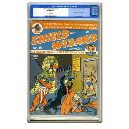 <B>Shield-Wizard Comics #6 (MLJ, 1941) CGC VF/NM 9.0 White pages.</B></I> MLJ's top two superheroes were joined by their sidekicks Dusty and Roy the Super-Boy in this issue (the first time the latter was seen in this title). The cover art is by Irv Novick. Overstreet 2005 VF/NM 9.0 value = $1,222; NM- 9.2 value = $1,650. CGC census 12/05: 2 in 9.0, 1 higher.