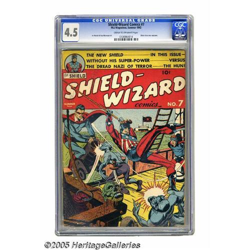 <B>Shield-Wizard Comics #7 (MLJ, 1942) CGC VG+ 4.5 Cream to off-white pages.</B></I> Jack Kirby cover. Irv Novick art. Overstreet 2005 VG 4.0 value = $254. CGC census 8/05: 1 in 4.5, 5 higher. <I>From the Aviator Collection.</B></I> <BR><BR><B>Important notice:</B> Heritage usually auctions material at the rate of 200-250 lots per hour. On some occasions eBay Live bid software or the Internet may not be able to keep up with the pace of the auction. We recommend placing a realistic absentee bid now as insurance to avoid disappointment. Occasionally the auctioneer may eliminate or reject an eBay Live bid, and the auctioneer may also reopen a lot after the close of the eBay live bidding (usually because we missed an audience bid), and may reject your bid even if it shows you as the winning bidder. By bidding via eBay Live, you agree that Heritage may award the lot to another bidder at its sole discretion under the circumstances described above or any other reasonable circumstances. Since eBay bids are not shown to us until we open the lot on the floor, we treat those bids just like floor bids. In most cases the floor responds before the eBay bid is presented to us, due to Internet lag time, so for consistency we have made it a policy that floor bids are always considered first over tie eBay live bids. Also please note that all Heritage lots purchased through eBay Live carry a 20% Buyer's Premium. Please make sure you read the Terms and Conditions before you bid. This lot is being auctioned in conjunction with a live floor auction by Heritage Galleries & Auctioneers. All final auction and invoice information will be supplied by Heritage Galleries & Auctioneers, and all other information should be considered preliminary. Lot:3075 <BR><BR><B>Winning Notification and Billing:</B> After the FINAL session in this auction is complete, Heritage will send e-mail and snail mail invoices. This process normally takes several days. All final auction and invoice information will be