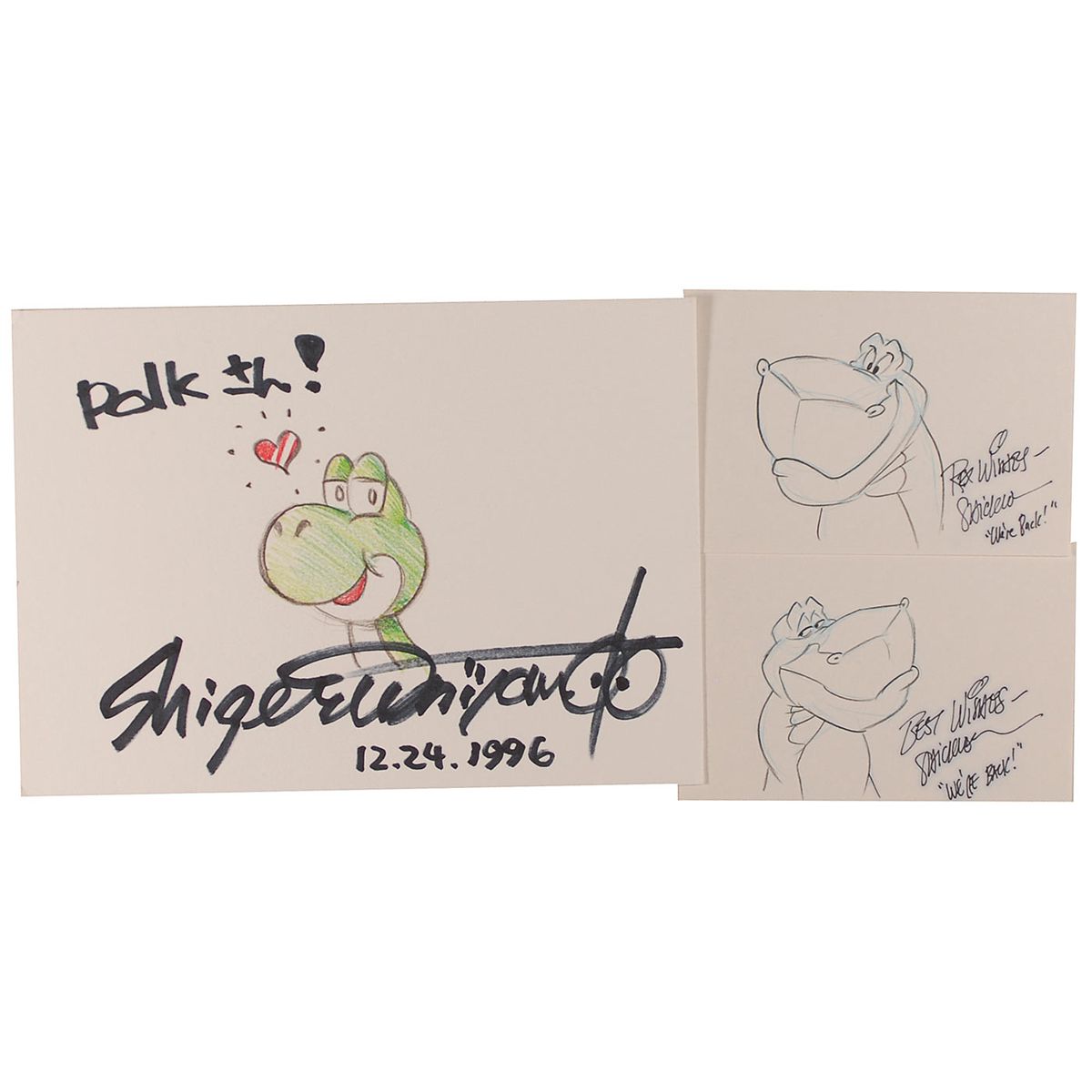 Japanese video game designer, producer, and mastermind behind such Nintendo classics as Mario Bros, Donkey Kong, The Legend of Zelda, and Star Fox. Three original sketches: one color pencil sketch on a 10.5 x 7.5 off-white cardstock sheet, signed in black felt tip, “Shigeru Miyamoto, 12.24.1996”; and two pencil sketches of Rex from the Spielberg film, A Dinosaur’s Story, on individual 6 x 4 off-white cards, each signed in black felt tip, “Best Wishes, Shigeru ‘We’re Back!’” In fine condition.