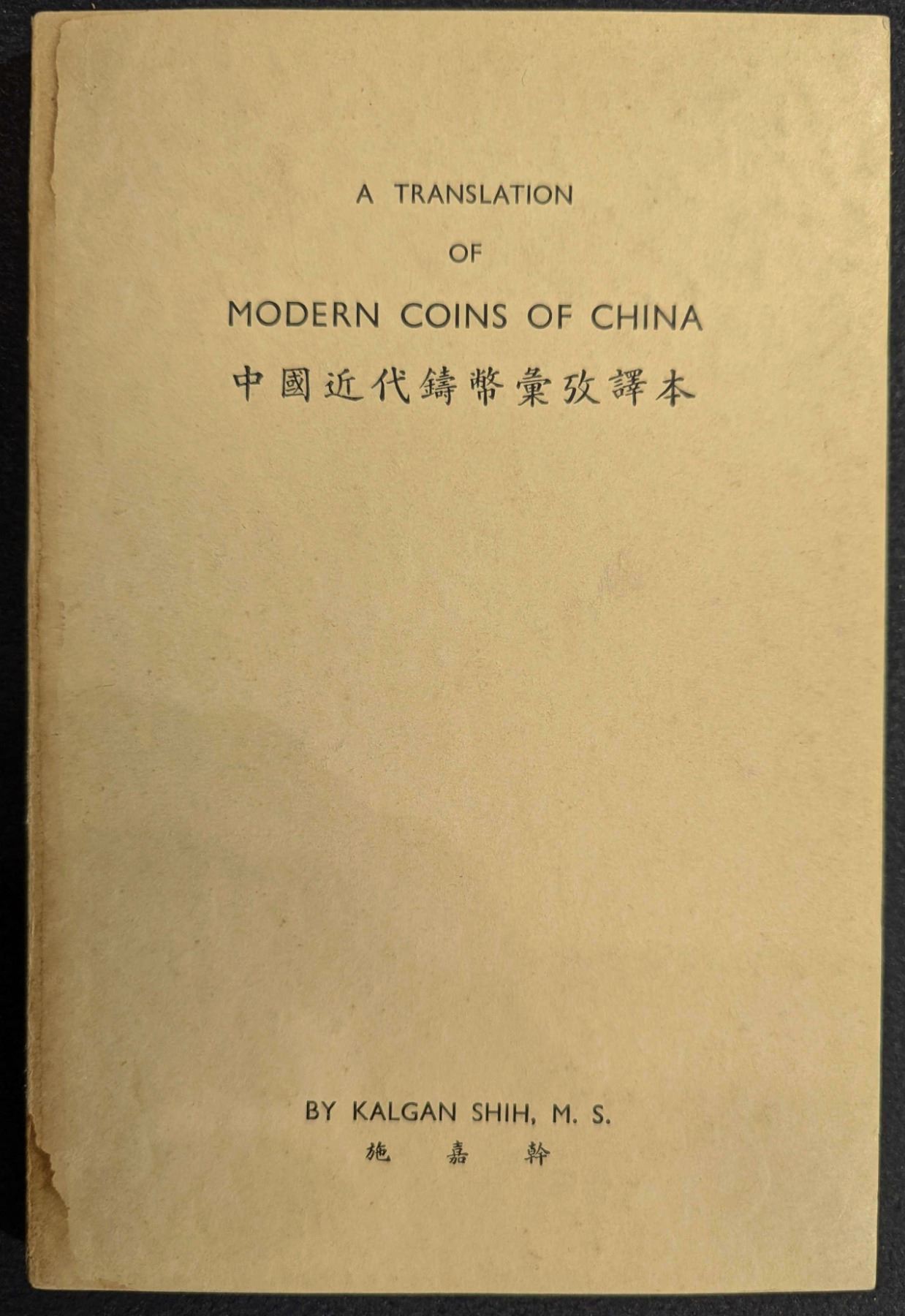 Shih, Kalgan M.S. A TRANSLATION OF MODERN COINS OF CHINA. Kalgan Shih, M.S. 1949. 12mo. (6), 96, (2) pages. Original tan printed card covers. tables. map. Fine. This book is an English translation of the Chinese language book, Modern Coins of China. Included following the translation are tables, a map, and a glossary showing Chinese characters and their English translations. Lot weight: 0 lbs 8oz. Subject(s): Chinese Coinage.