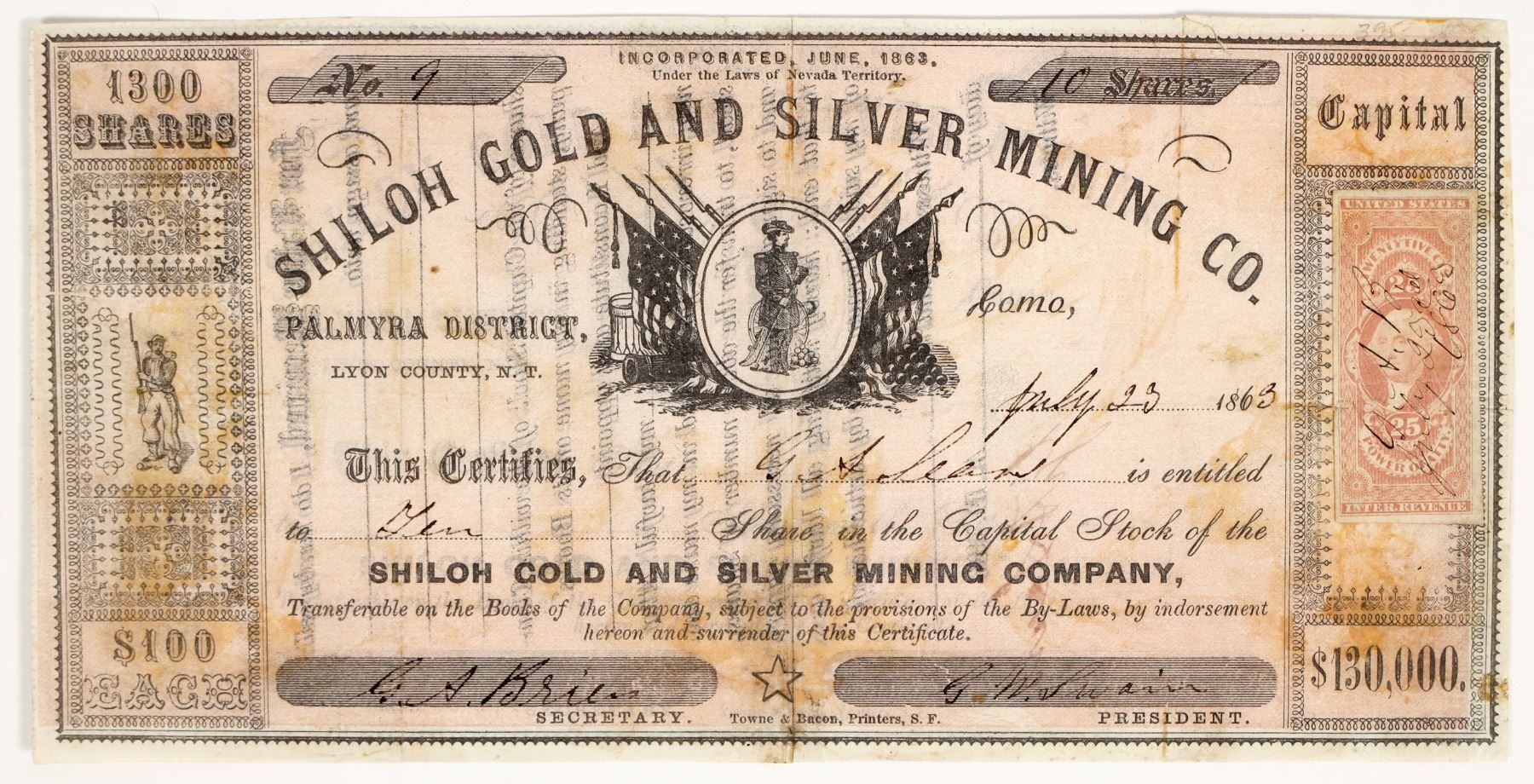 Shiloh Gold & Silver Mining Co. Stock Certificate, Como, Nevada Territory, 1863 [202743]
