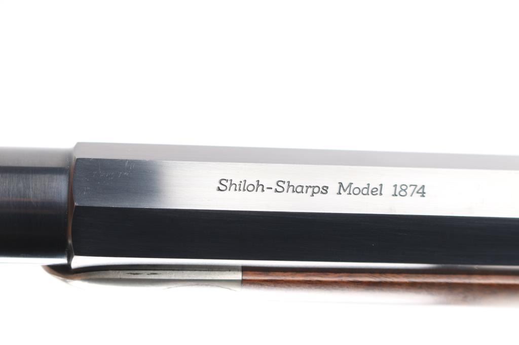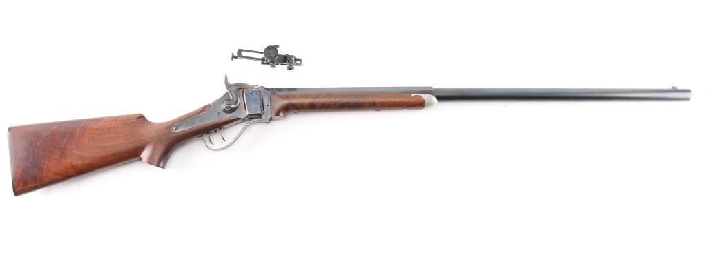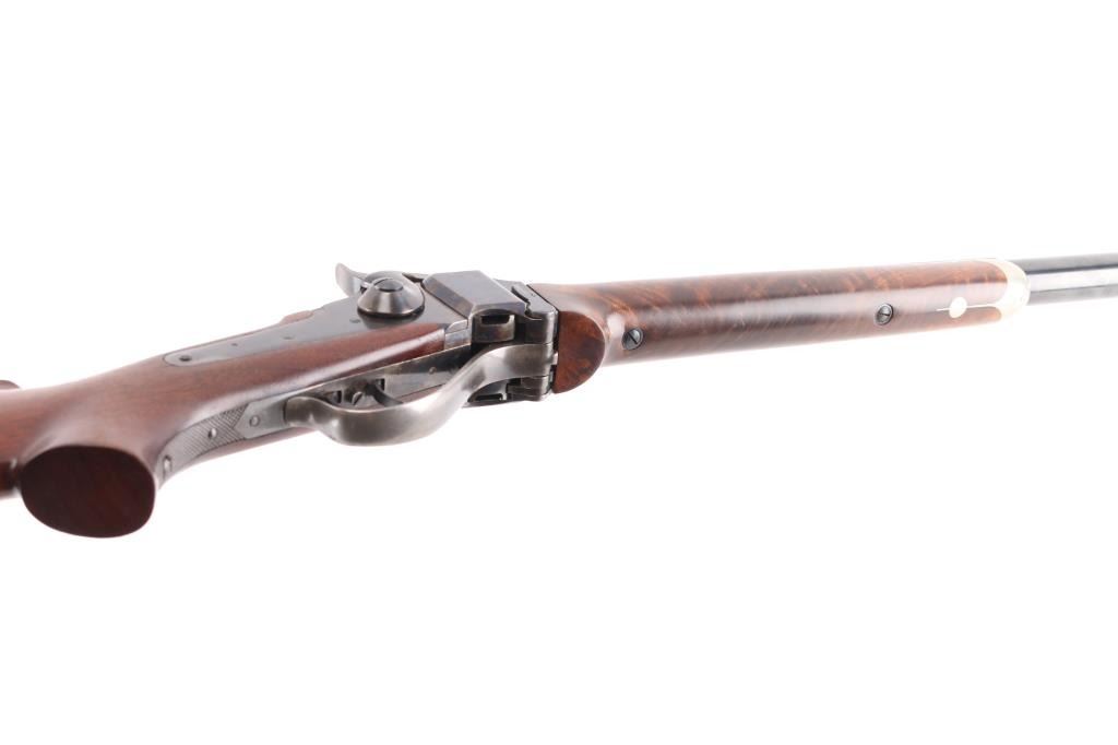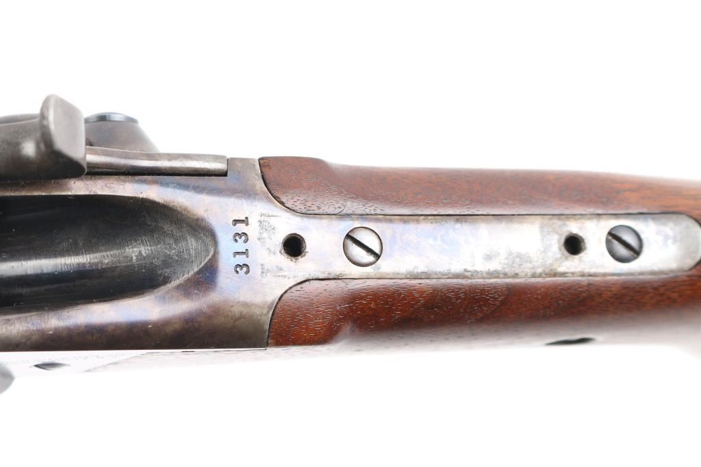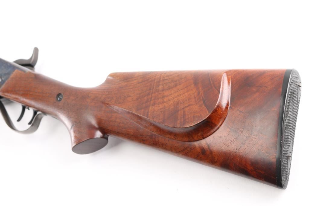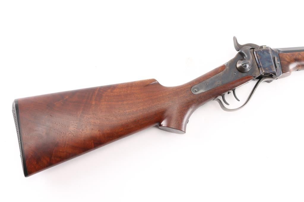 Early, high quality reproduction of the Sharps Rifle Company Model 1874 falling block single shot sporting rifle. Manufactured in Farmingdale, NY circa 1976-1983. Features a blued 30" heavy part-octagon barrel, dovetailed blade front sight, mid-range vernier tang sight (provided but not installed, no hardware), double set triggers, case hardened receiver, knurled hammer spur, smooth semi-fancy walnut forend with ornate pewter tip, semi-pistol grip shoulder stock with right handed shadow line cheek piece & checkered black synthetic buttplate. Markings: Barrel is stamped on the underside “9774” & “40 70”. The receiver is stamped “SHILOH RIFLE MFG. CO./FARMINGDALE, N.Y.” & “3131”. Rifle retains approximately 95% of its original finish with the majority of the wear on the lever and lower tang. The action is mechanically sound, the bore is pristine and the wood stocks are fine with minor losses & a couple ¼” hairline cracks extending from the sideplate.