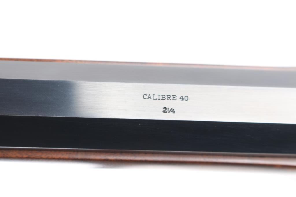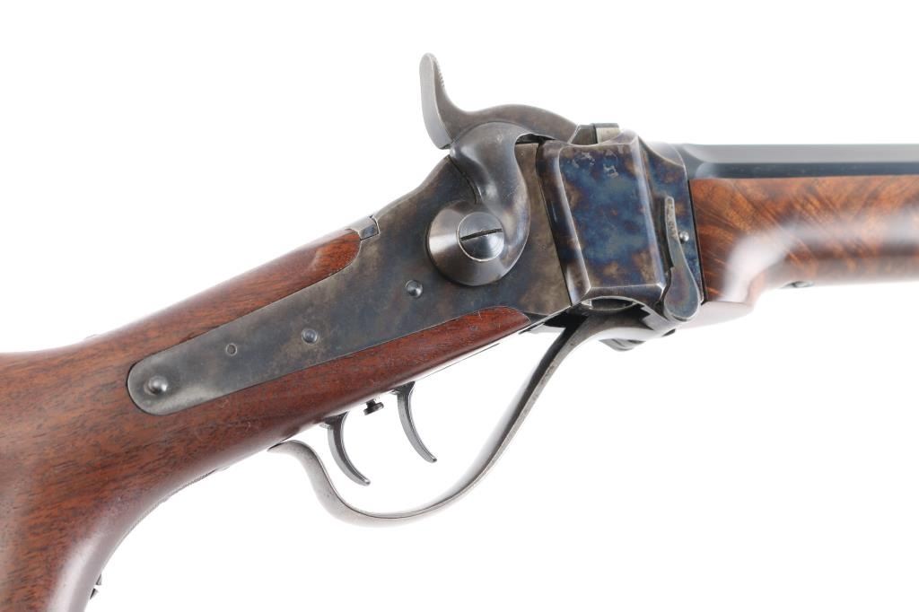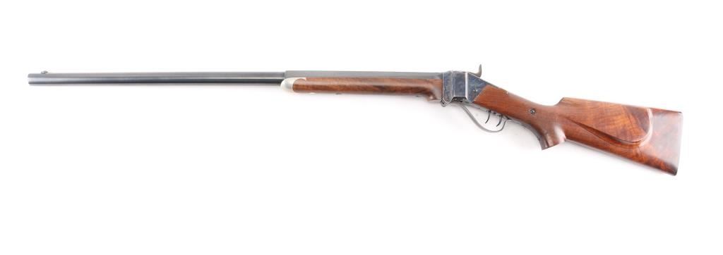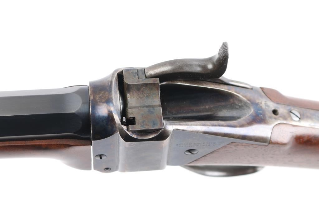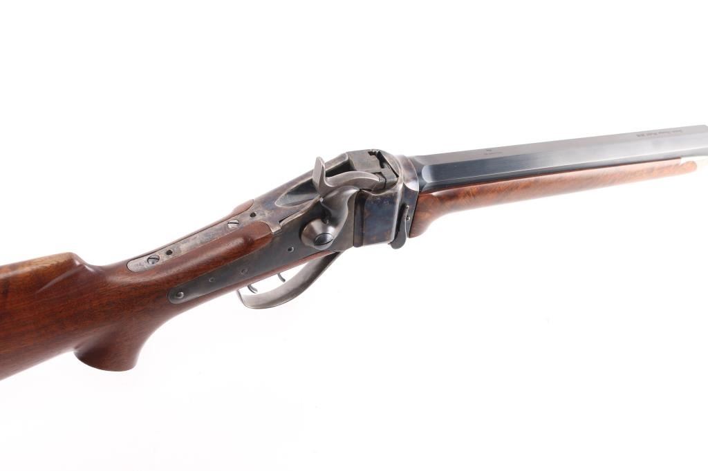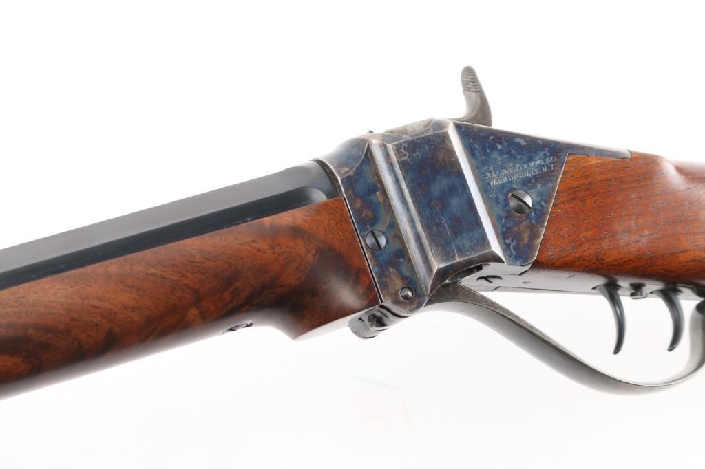 Early, high quality reproduction of the Sharps Rifle Company Model 1874 falling block single shot sporting rifle. Manufactured in Farmingdale, NY circa 1976-1983. Features a blued 30" heavy part-octagon barrel, dovetailed blade front sight, mid-range vernier tang sight (provided but not installed, no hardware), double set triggers, case hardened receiver, knurled hammer spur, smooth semi-fancy walnut forend with ornate pewter tip, semi-pistol grip shoulder stock with right handed shadow line cheek piece & checkered black synthetic buttplate. Markings: Barrel is stamped on the underside “9774” & “40 70”. The receiver is stamped “SHILOH RIFLE MFG. CO./FARMINGDALE, N.Y.” & “3131”. Rifle retains approximately 95% of its original finish with the majority of the wear on the lever and lower tang. The action is mechanically sound, the bore is pristine and the wood stocks are fine with minor losses & a couple ¼” hairline cracks extending from the sideplate.