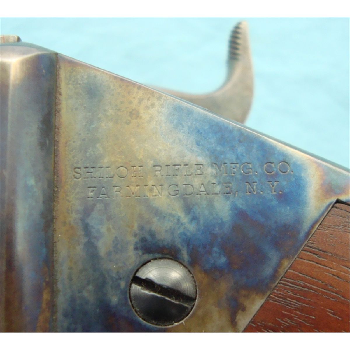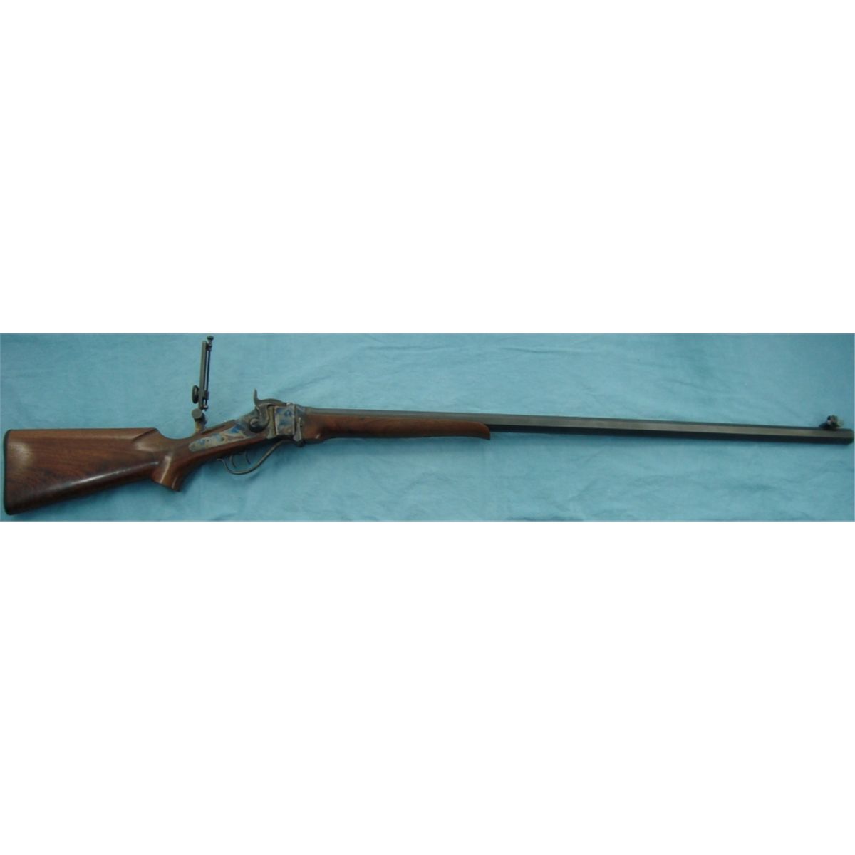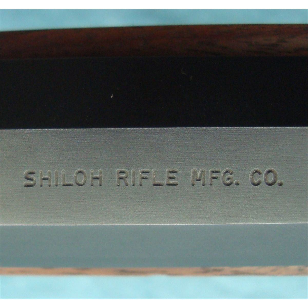 #5903; 45-70 cal. w/34" oct. bbl. marked "Old Reliable Shiloh Rifle Mfg. Co. Cal. 45 2/10". Bore is bright & bbl retains excellent blue. Receiver is nicely case colored. Dbl set triggers, long range adjustable veneer tang sight & wind gauage w/spirit level front sight. Walnut stock. Gun is in overall near new condition. Shiloh Sharps rifles w/"Old Reliable" marking on the bbl. are scarce as they were marked that way for a very limited amount of time.