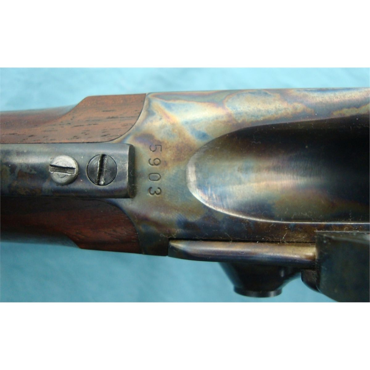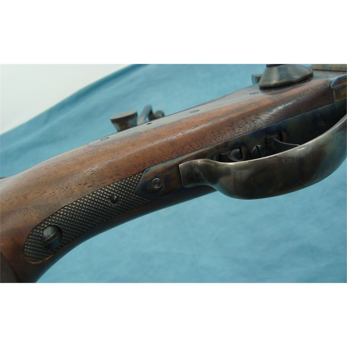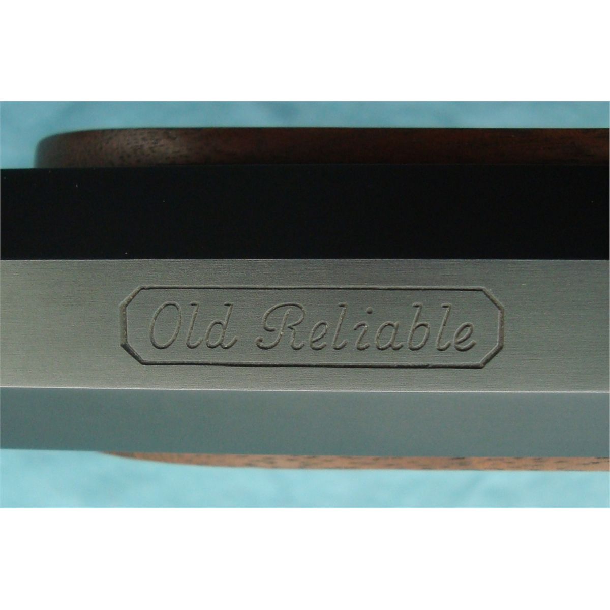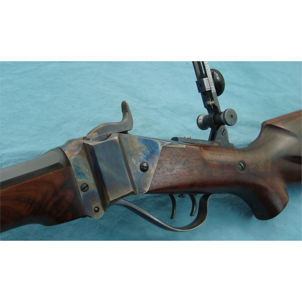 #5903; 45-70 cal. w/34" oct. bbl. marked "Old Reliable Shiloh Rifle Mfg. Co. Cal. 45 2/10". Bore is bright & bbl retains excellent blue. Receiver is nicely case colored. Dbl set triggers, long range adjustable veneer tang sight & wind gauage w/spirit level front sight. Walnut stock. Gun is in overall near new condition. Shiloh Sharps rifles w/"Old Reliable" marking on the bbl. are scarce as they were marked that way for a very limited amount of time.