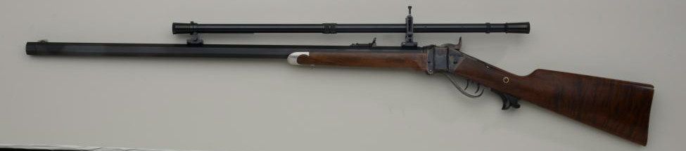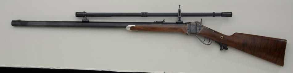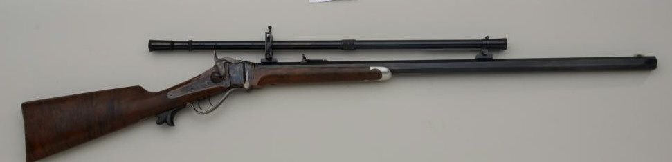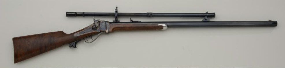 Shiloh Sharps Model 1874 Sporting rifle, .50 caliber, 2-1/2” case, 32” octagon barrel with Bridgeport collar, blue and case hardened finish, deluxe wood straight stock with pewter fore end tip, checkered steel buttplate, double set triggers, hard rubber finger rest behind lever, buckhorn rear sight, blade front sight, mounted with telescopic adjustable scope displaying crystal clear optics, #1098B. Thisoutstanding rifle is in overall excellent condition showing little use or handling, approx. 99% original blue finish to barrel and approx. 99% vivid case colors on receiver, hammer and loading lever; wood isalso excellent with beautiful flame graining; accompanied by a heavy duty aluminum padded hard case. Est.: $1,750-$3,500.