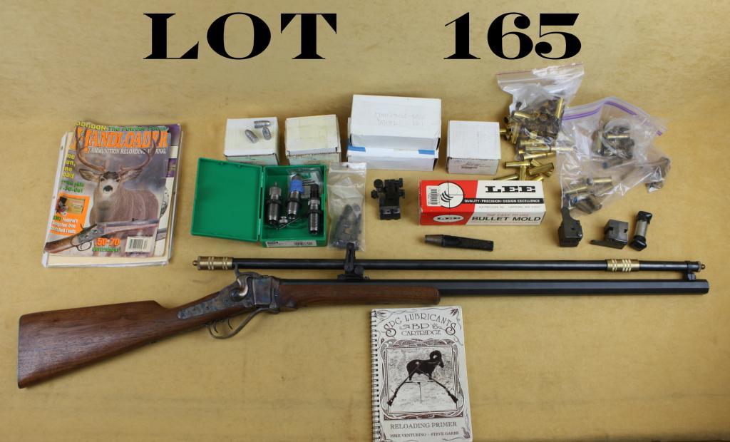 Shiloh Sharps reproduction of a Model 1874 Sporting rifle, .50 cal., 1-3/4” 30” octagon barrel, blue and case hardened finish, wood stocks, #9416. This gun is in overall excellent condition showing little use orhandling, mat black finish on barrel, case color on receiver, lockplate, lever and hammer, double set triggers, mounted with a Wm. Malcolm full-length tube scope with very good optics and brass lens protective covers. Also accompanied by Dies, bullet mold, reloading primer softback book by Mike Venturino, lead bullets, brass shells and other related reloading materials. A great lot. Est.: $2,000-$4,000.