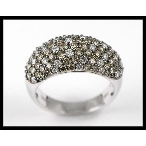 Shimmering ring with 59 round cut brown diamonds and 27 full cut white diamondsthat weigh 2.50 carats pave set in 14K White Gold. The size 7 ring measures 10.26 millimeters (0.40 inches) wide and weighs 7.20 grams total weight.