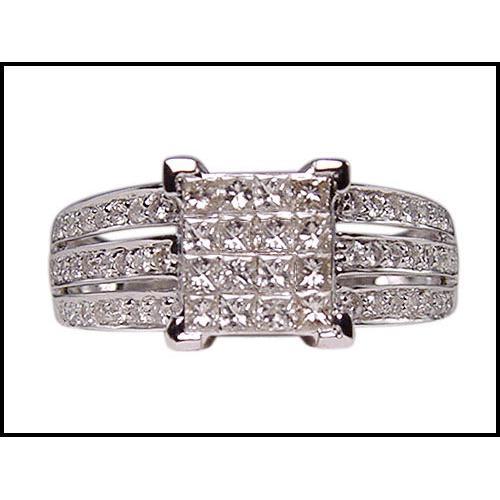 Shimmering ring with 16 princess cut diamonds that weigh 0.57 carats and 44 diamonds that weigh 0.33 carats set in 18K white gold. The decorative portion of the size 7-1/4 ring measures 22 millimeters (7/8 inches) wide x 8 millimeters (5/16 inches) long. The ring weighs 5.00 grams total weight.