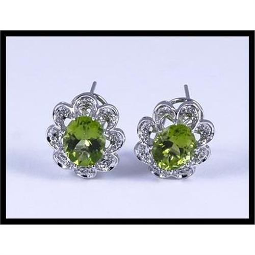 Shimmering earrings with 2 oval cut green peridots that weigh approximately 5.37 carats and 48 single cut diamonds that weigh 0.25 carats set in 18K white gold. The earrings measure 17.2 millimeters (0.68 inches) x 15.0 millimeters (0.59 inches) and weighs 7.50 grams total weight.