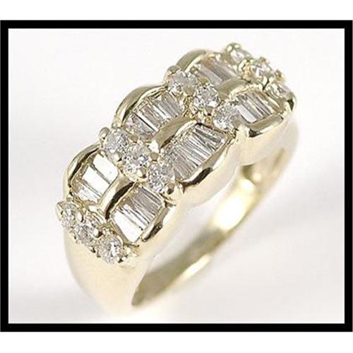 This beautiful lady's 14K yellow gold ring is set with 12 full cut diamonds that have an estimated total weight of 0.40 carats. 18 pieces of tapered baguette diamonds are also set with an estimated total weight of 0.40 carats. This sized 6 ring weights 7.50 grams. The diamonds are nice and sparkles.