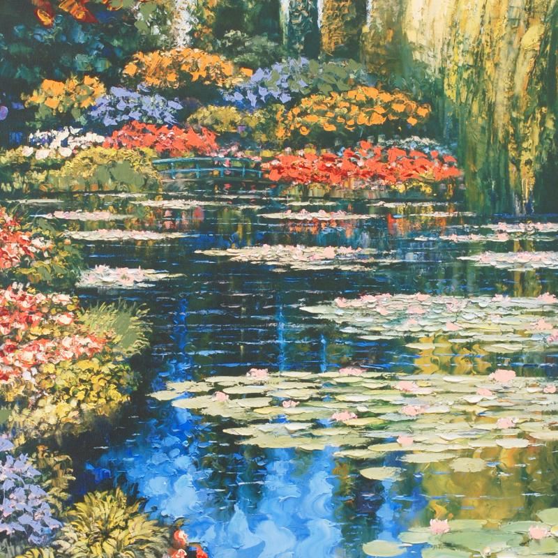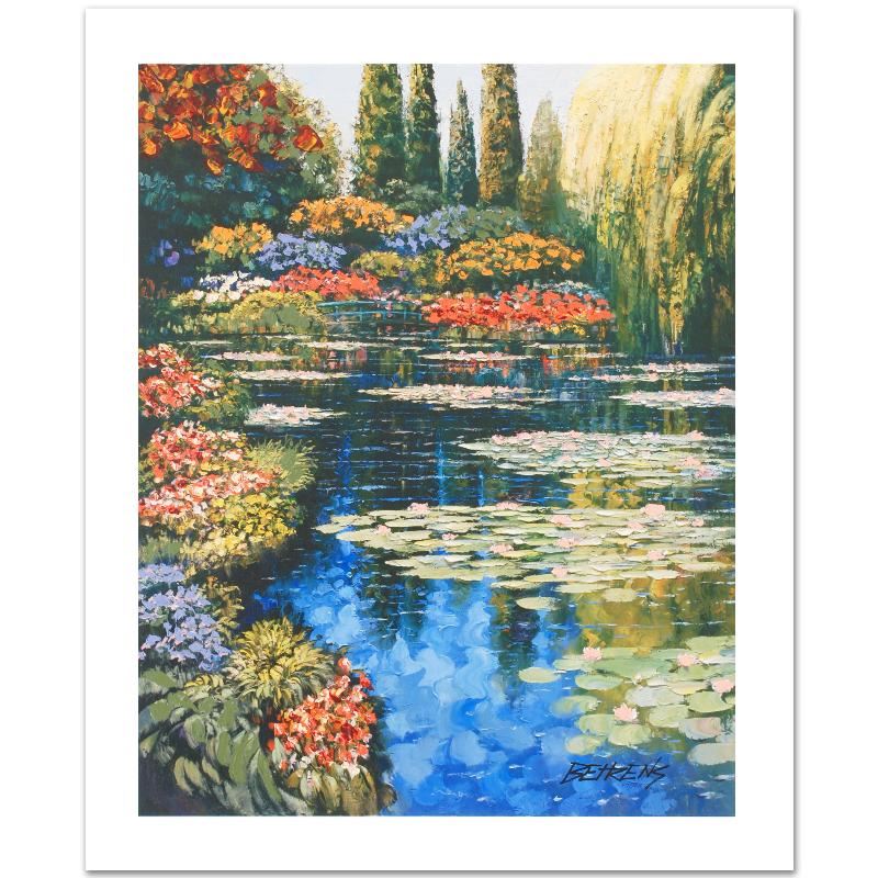 With bright colors and lush textures, Howard Behrens' artwork adds a tropical and exotic feel to any art collection. "Shimmering Waters - Giverny" is a limited edition hand embellished giclee on canvas. Numbered and hand signed by the artist. Includes Certificate of Authenticity! Measures approx. 20" x 25"(image).