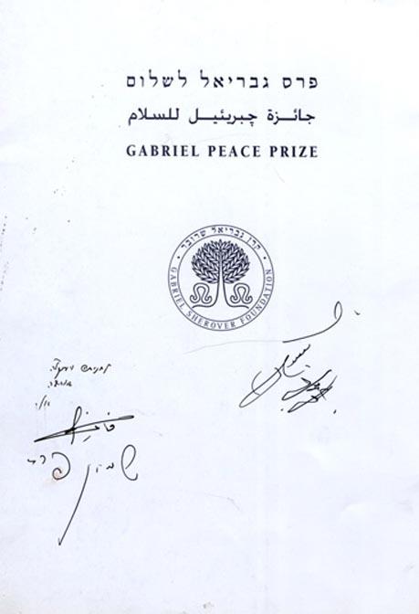 Printed booklet commemorating the Gabriel Peace Prize, signed and inscribed on title page of pamphlet by Israeli Prime Minister Shimon Peres, in Hebrew, and Jordan's King Hussein I bin Talal, in Arabic. King Hussein and Prime Minister Peres attended the Gabriel Peace Prize ceremony, which was awarded to Ambassadors Elyakim Rubinstein and Fayez Tarawneh for their roles in the negotiations of the Israel-Jordan peace treaty on 26 October 1994. Document, in Hebrew, Arabic and English runs 16pp., printed on cardstock. Two other signatures are possibly the reward recipients, though not positively identified. Also includes five photographs, including a fold-out photo of the signing of the Israel-Jordan Peace Treaty, depicting President Bill Clinton, Shimon Peres, Yithak Rabin, and King Hussein, among others. Document is also accompanied by a typed letter from King Hussein's office, dated 25 August 1996, addressed to a Hanita Halevy. Letter thanks her for a gift of poems by her cousin Ely Rubinstein and reads in part, ''Dear Ms. Halevi. His majesty appreciates receiving a copy of your book of poems translated into Arabic and also your personal dedication -- His Majesty is looking forward to reading your poems.Yours Sincerely, Brigadier Ali Shukri''. Two stamped holes through letter and expected folding. Signed document in very good condition.
