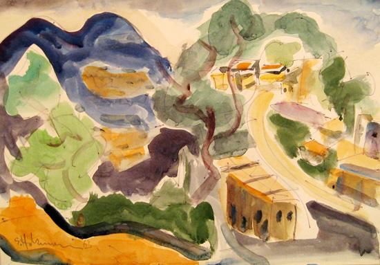 Shimshon Holzman, Israeli Art, 1907 - 1986, Landscape, 1963, Watercolor, 35x50cm, Signed., , , , ,