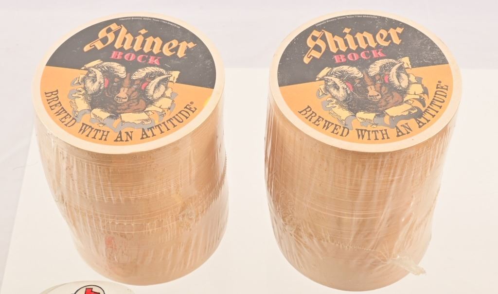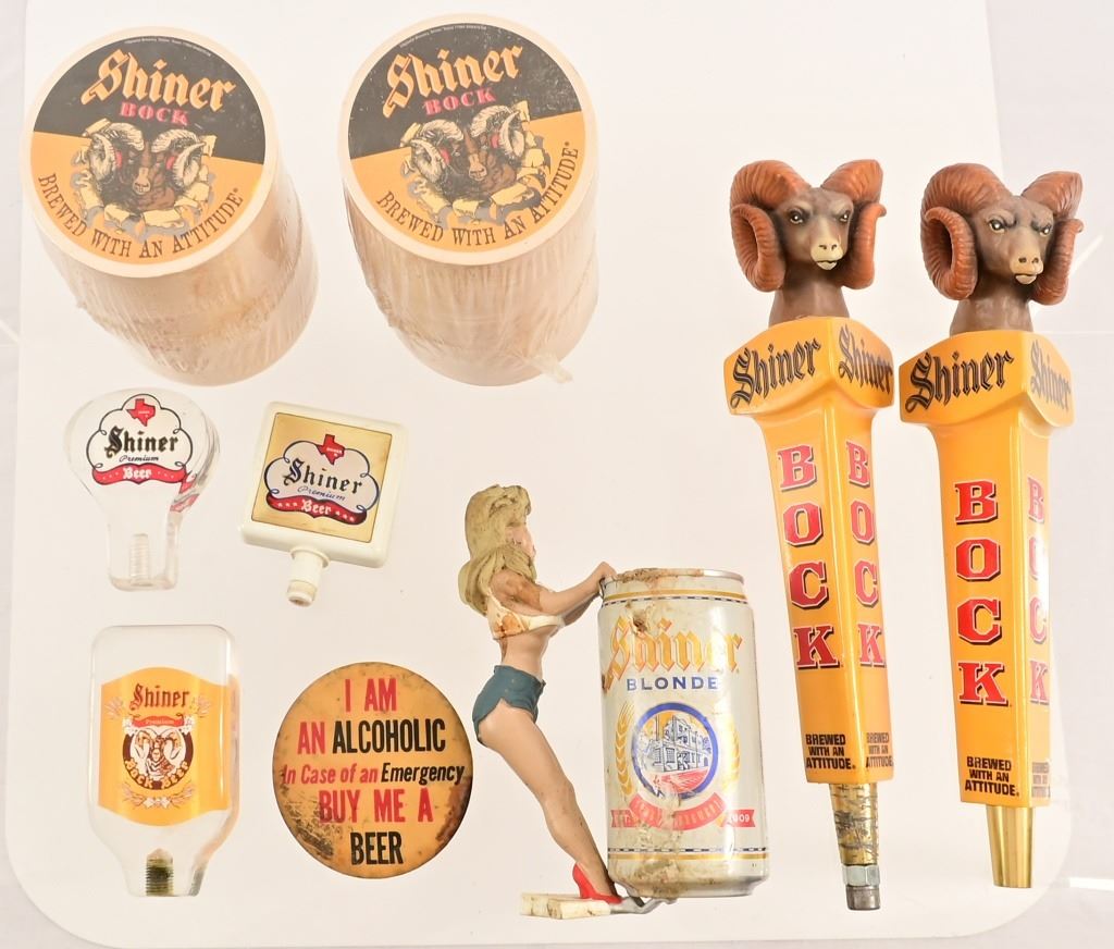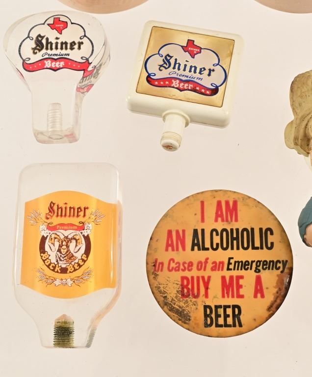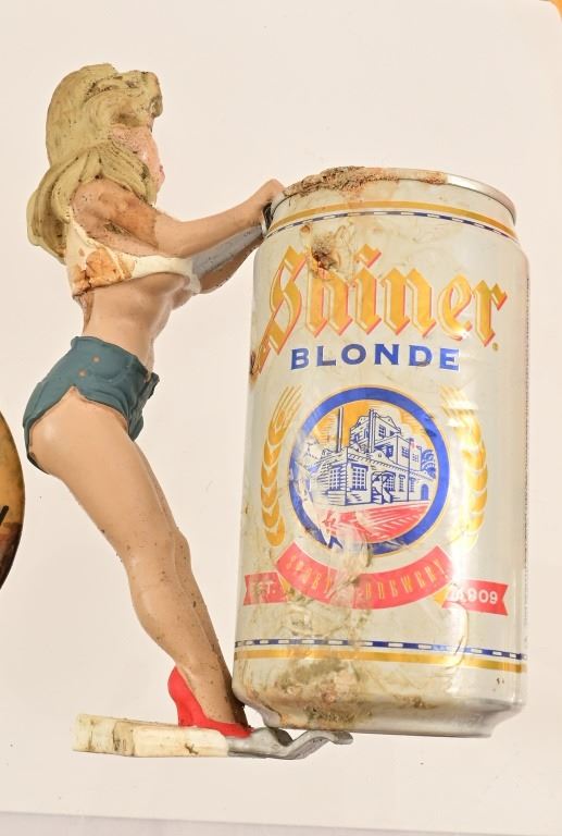 (5) Taps, cardboard coasters. Shiner blonde pinup girl can holder. Advertisement pin.