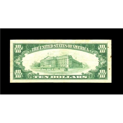 <B>Shiner, TX</B></I> - $10 1929 Ty. 1 <B>The First NB</B></I> Ch. # 5628<BR>A large size hoard of Uncirculated Brown Backs is known from this Lavaca County locale making this a collectible bank. However, for the Texas specialist, Shiner small size notes number only eight survivors, making them much more scarce than the large size notes available. This piece is adequately margined, and though it may have been wet at one time it retains some crispness to the paper. <B>Fine.</B></I>