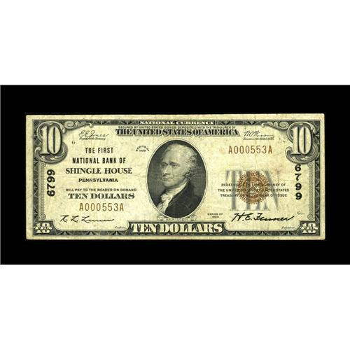 <B>Shingle House, PA</B></I> - $10 1929 Ty. 1 <B>The First NB</B></I> Ch. # 6799<BR>A nice evenly circulated example displaying one of the great town names to be found on any National. This piece comes from our May, 2004 sale, where it realized $2185. It certainly isn't worth any less today. Nice <B>Fine+,</B></I> sure to see bidding reach well into the area of...<BR><BR><b>Shipping:</b> Coin/Currency (<a target="_blank" href="http://www.heritageauctions.com/common/shipping.php">view shipping information</a>)