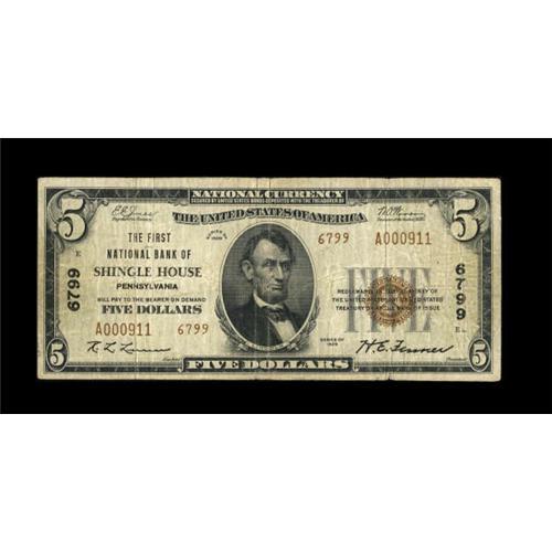 <B>Shingle House, PA</B></I> - $5 1929 Ty. 2 <B>The First NB</B></I> Ch. # 6799<BR> This is a very scarce piece possessing one of the most sought after town names in the field of National Bank Note collecting. Ten small have been documented, with only three of those notes being Type 2s, and this note being the only Type 2 $5. It is also a virtual twin in grade to the example from here we sold back in 2004, when a $10 Type 1 realized $2185 in our May Central States auction. <B>Fine+</B></I>.<BR><BR><b>Shipping:</b> Coins & Currency (<a target="_blank" href="http://www.heritageauctions.com/common/shipping.php">view shipping information</a>)