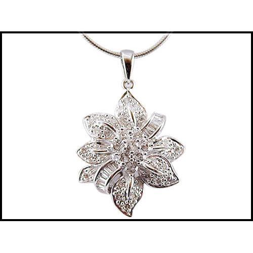 Shining pendant with 16 baguette cut diamonds that weigh 0.17 carats and 36 diamonds that weigh 0.83 carats set in 18K white gold. The pendant measures 21 millimeters (13/16 inches) wide x 27 millimeters (1-1/16 inches) long and weighs 5.00 grams total weight.