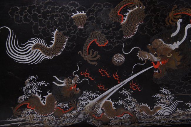 Shinshao An Baeukee Foochow, China hand painted black lacquer server tray. SIZE: see attached ruler photo. Photos are part of the description representing the condition report and can be used for authentication prior to the sale date. Pangaea Auctions urges Bidder's to view all attached photos in detail. #(Chinese, 19th-20th Century, Wood, Asian, ).