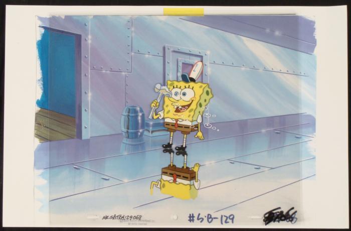 This animation cel and reproduction background are from the Nickelodeon TV show SpongeBob Squarepants. The story takes place under the deep blue sea in Bikini Bottom, where SpongeBob resides. SpongeBob, who is a yellow, porous sponge, is your typical happy-go-lucky character, as he is always cheerful and enjoys making people laugh. Patrick Star, SpongeBob's neighbor who is a starfish, is your average children's show idiot, as he boasts knowing nothing and is often getting himself into ridiculous situations. Between the homes of these two lies the home of the miserable Squidward, a squid, who is known for being grouchy and playing tricks on SpongeBob and Patrick. Both SpongeBob and Squidward work at the Krusty Krab, a fast food business run by the greedy money-loving Mr. Krabs, a crab, the arch rival of the evil, possibly misunderstood, Plankton. Another neighbor, Sandy Cheeks, an athletic squirrel who normally wears an astronaut's space suit, was introduced in "Tea at the Treedome." She spends most of her time inventing and experimenting. Why is everything very shiny?Original Printed Background and Animated Cel Overall Size of Background: 10 1/2" x 17" Overall Size of the Cel: 10 1/2" x 12 1/2" Very good conditionThis is an original hand-painted cel set-up used in the production of an episode of "SpongeBob SquarePants." Each one-of-a-kind set-up represents a slight change in position of the characters. When individually photographed and projected in rapid succession, the images appear to move.