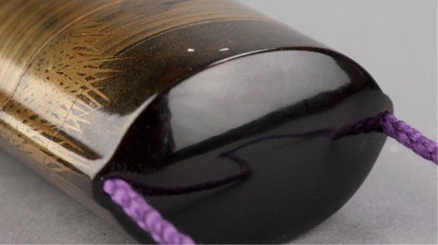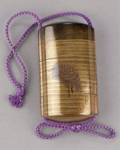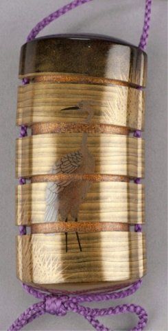 A fine togidashi inro of four cases. Shiomi Masanari School, Late 18th century. Decorated in gold and silver lacquer with two herons standing in a lake with clumps of reed at the sides and yasurime sky above, inside nashiji. Unsigned. 3" x 2 1/4". The Helen & Jack Mang Collection 24826 Sotheby & Co. London