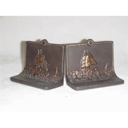 A pair of bronze bookends. 5 1/8'' long x 4 1/4'' tall. Sailing ship in low relief. Unmarked.