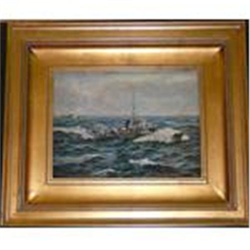 Underway in heavy seas. Another ship in the squadron is visible in the distance. Subtle tones and realistic features. Signed by J. Clark. A beautifully detailed oil painting by a contemporary artist. Handsome handcrafted frame with wonderful details. Dimensions are of the painting. 12x16 Framed oil on board - $395. 24x30 Framed oil on canvas - $895.