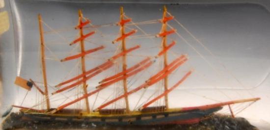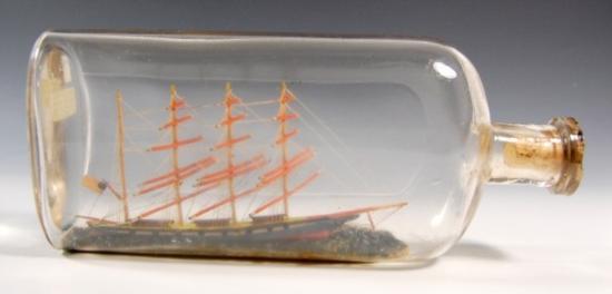 Ship in a Bottle - 4 Mast American Bark - Flying American flag. Blue hull, red waster line and black false gun ports. Interior painted ocean. An early bottle with carved cork stopper. Circa 1910 Size: 9.75 L X 4.25in H X 2.5in D Weight: approx 2lbs
