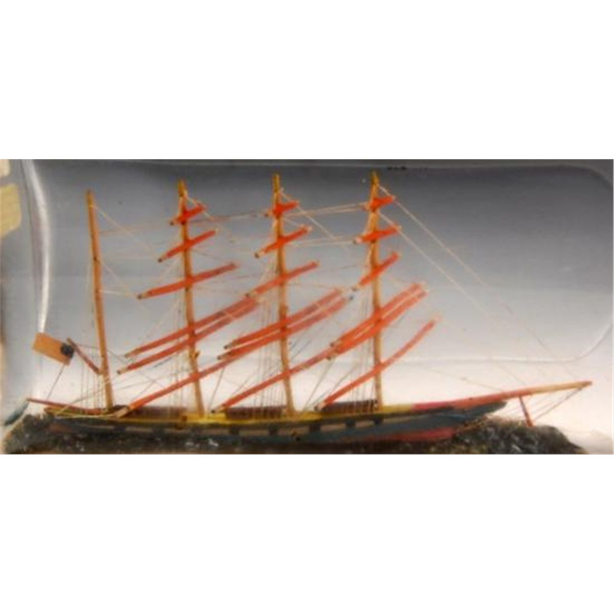 Ship in a Bottle - 4 Mast American Bark - Flying American flag. Blue hull, red waster line and black false gun ports. Interior painted ocean. An early bottle with carved cork stopper. Circa 1910 Size: 9.75 L X 4.25in H X 2.5in D Weight: approx 2lbs