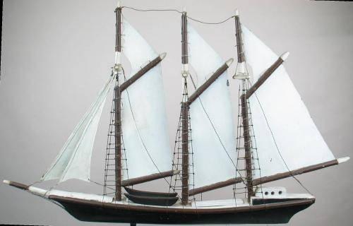 Ship weathervane approx 28in long with painted galvanized metal sails by Frank Adams, Martha's Vineyard, MA. In XOC with some blistering on the other side of the sails. (decoy)