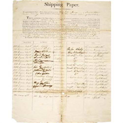 <B>Shipping Papers for the Whaling Ship </B></I><B><I>John James</B></I></B></I><B> of Nantucket, 1811</B></I> 13” x 16.5”, one page, partially printed, June 24, 1811, Nantucket, Massachusetts. An agreement between the <I>John James</B></I>’s master, Reuben Clasby, and the ship’s crew, apportioning the future proceeds from the whaling expedition to “the Pacific Ocean & elsewhere.” A fine, early whaling document. Toned and torn at the folds, else near fine.<BR><BR><BR><b>Shipping:</b> Flat Material, Large (<a target="_blank" href="http://www.heritageauctions.com/common/shipping.php">view shipping information</a>)