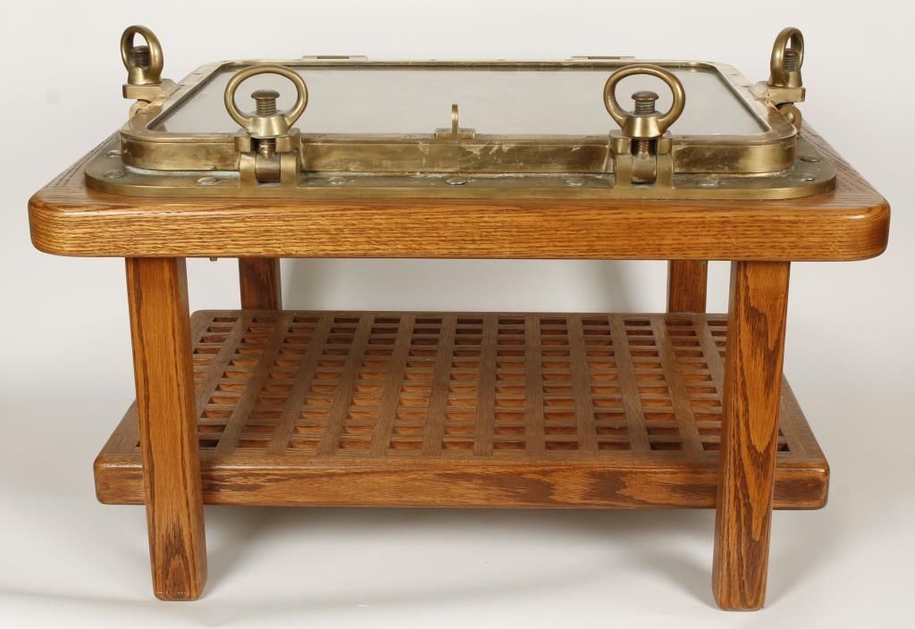 Constructed of a ship's window. USS Tucson was the name of the ship. The ship was built in 1945 and sold for scrap in Feb of 1971. It was a class light cruiser. Brass casing, made into a coffee table with oak base. Unique piece!