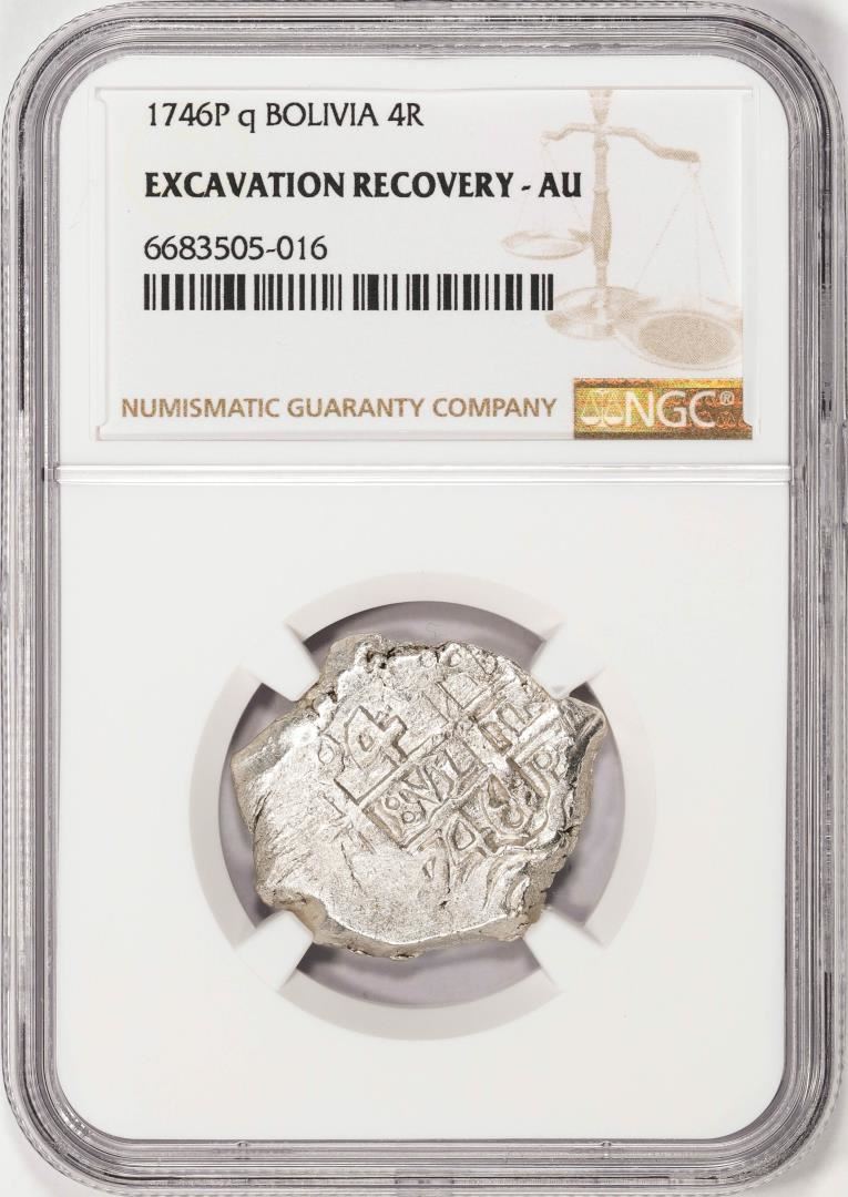 Shipwreck 1746P q Bolivia 4 Reales Silver Coin NGC AU Excavation Recovery