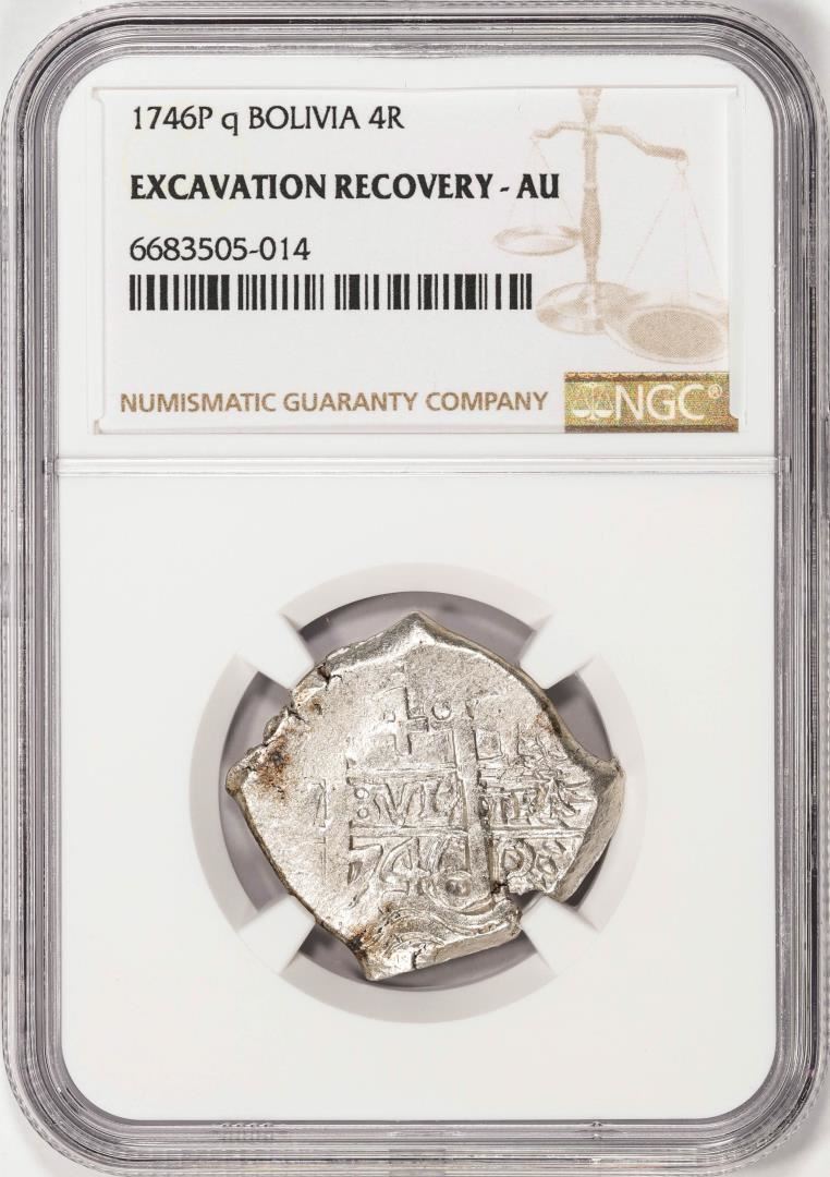 Shipwreck 1746P q Bolivia 4 Reales Silver Coin NGC AU Excavation Recovery