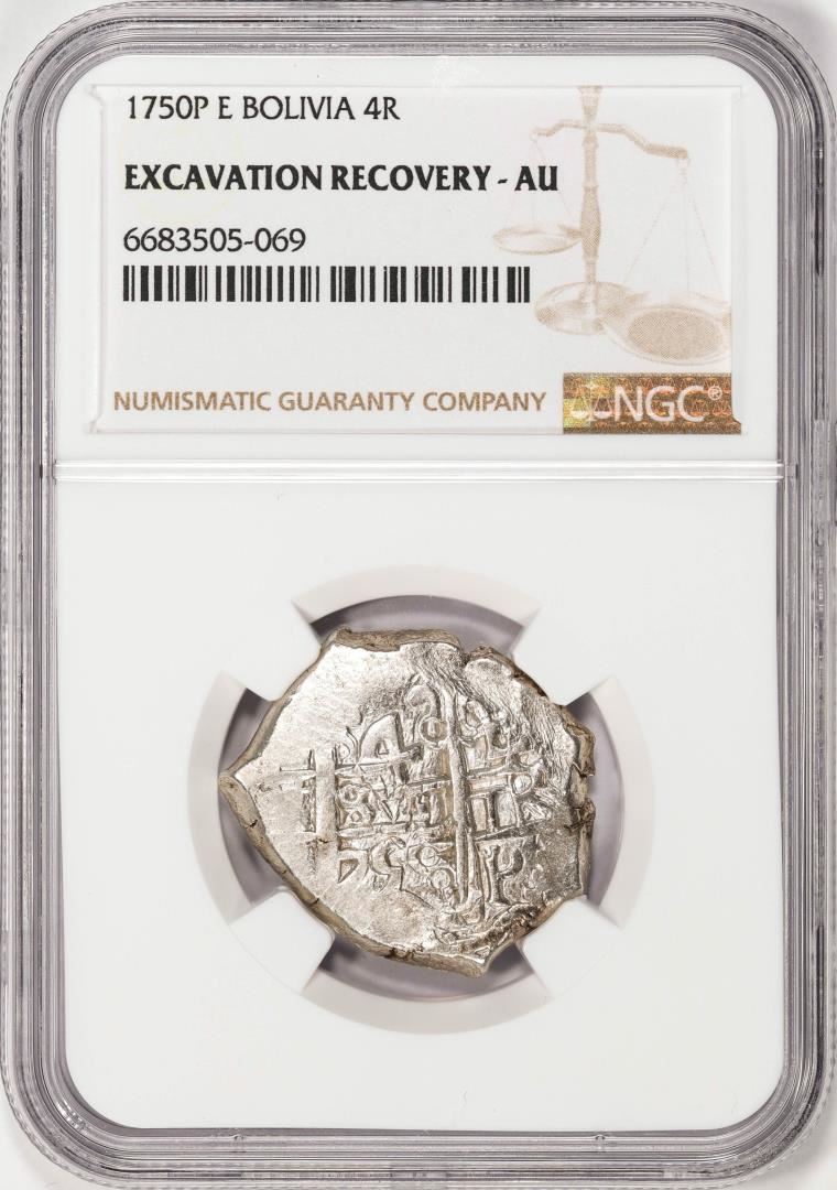 Shipwreck 1750P E Bolivia 4 Reales Silver Coin NGC AU Excavation Recovery
