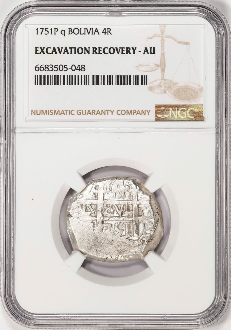 Shipwreck 1751P q Bolivia 4 Reales Silver Coin NGC AU Excavation Recovery
