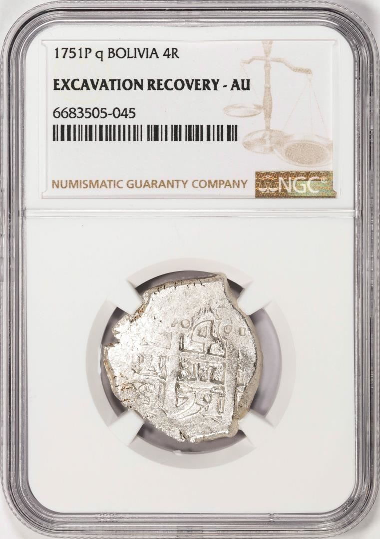 Shipwreck 1751P q Bolivia 4 Reales Silver Coin NGC AU Excavation Recovery
