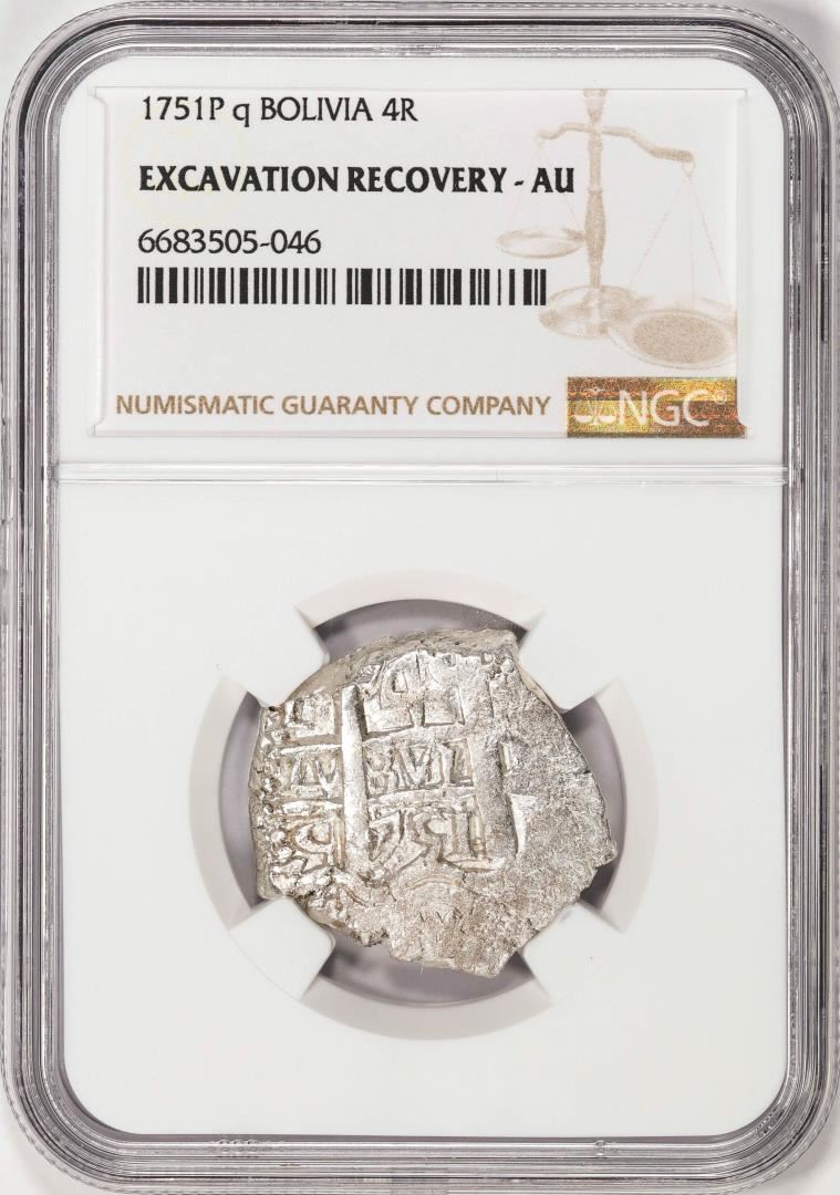 Shipwreck 1751P q Bolivia 4 Reales Silver Coin NGC AU Excavation Recovery
