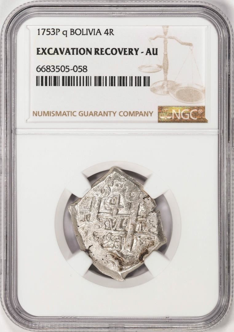 Shipwreck 1753P q Bolivia 4 Reales Silver Coin NGC AU Excavation Recovery