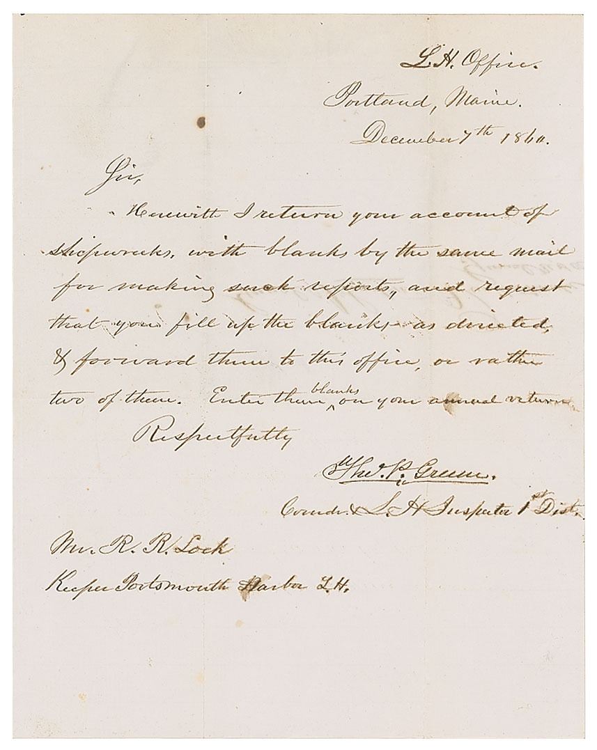 ALS signed “Theo. P. Greene,” one page, 7.75 x 9.75, December 7, 1860. Written from the Lighthouse Office of Portland, Maine, a letter from 1st District Lighthouse Inspector Theodore P. Greene to R. R. Lock, the lighthouse keeper at Portsmouth Harbor, in full: "Herewith I return your account of shipwrecks, with blanks by the same mail for making such reports, and request that you fill up the blanks—as directed, & forward them to this office, or rather two of them. Enter these blanks on your annual returns." In fine condition.