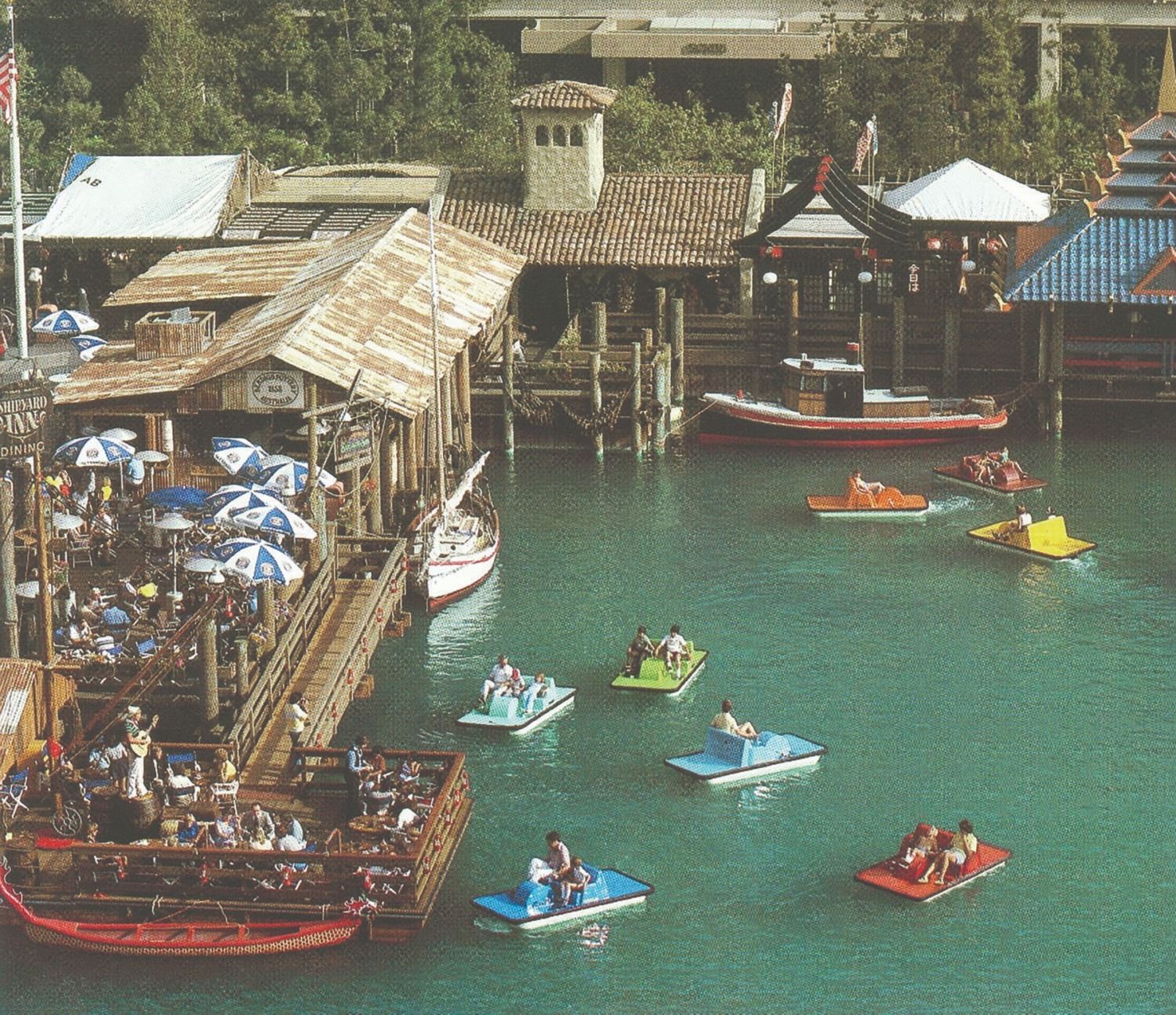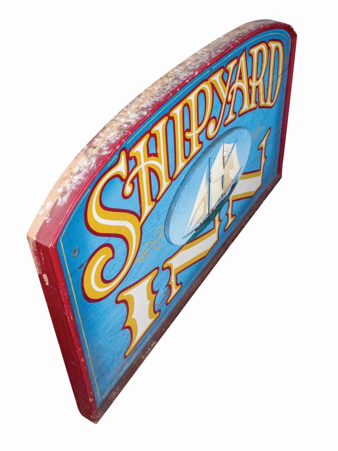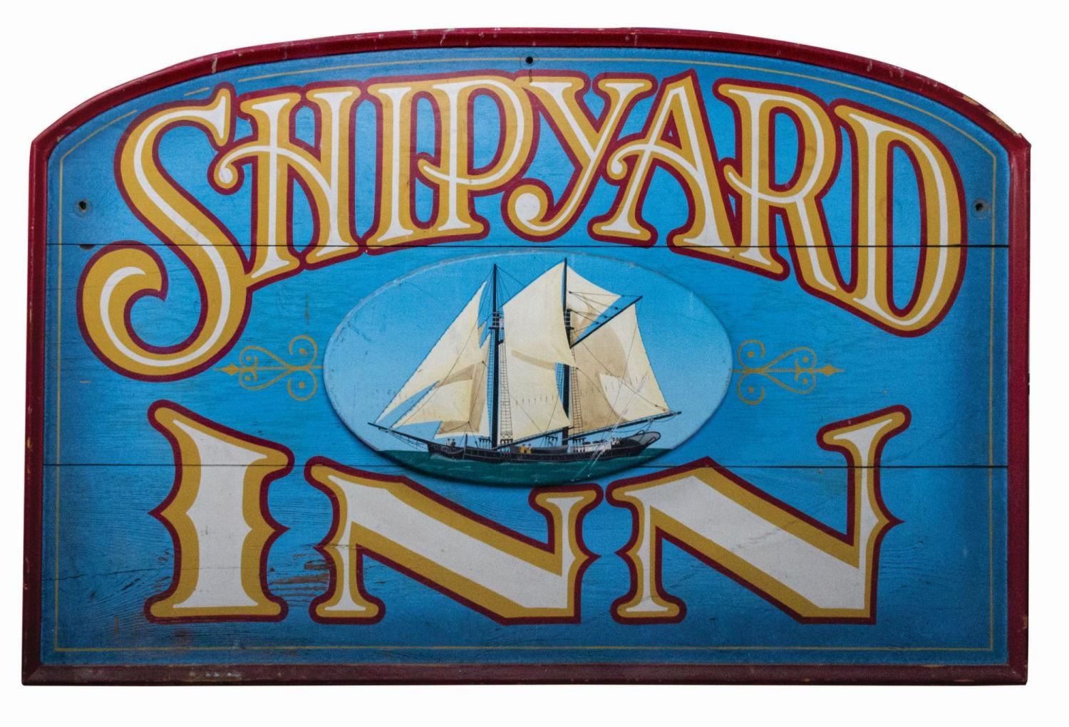 (Disneyland Hotel, c.1980s) A wonderful original hand-crafted wooden sign from the Shipyard Inn at the Disneyland Hotel Marina. The sign is constructed of a heavy duty red wooden frame filled with three custom trimmed planks of wood which have been elaborately hand-painted with the restaurant's text logo over a sky-blue field. An additional oval piece of wood featuring a hand-painted image of a clipper ship is applied at center. The sign was hung outside the Shipyard Inn, and is equipped with holes along the top for attachment of hardware. Measuring 34.25"x54" and 2.5" deep, the piece is in good condition, exhibiting some chipping, scratches, scuffs, spot staining, strips of paint loss, and general weathering to both the face and the reverse from outdoor use. The sign remains an iconic piece, vividly evoking a bygone era of the legendary Disney Hotel. This item may require special shipping arrangements, please inquire for details and estimates.