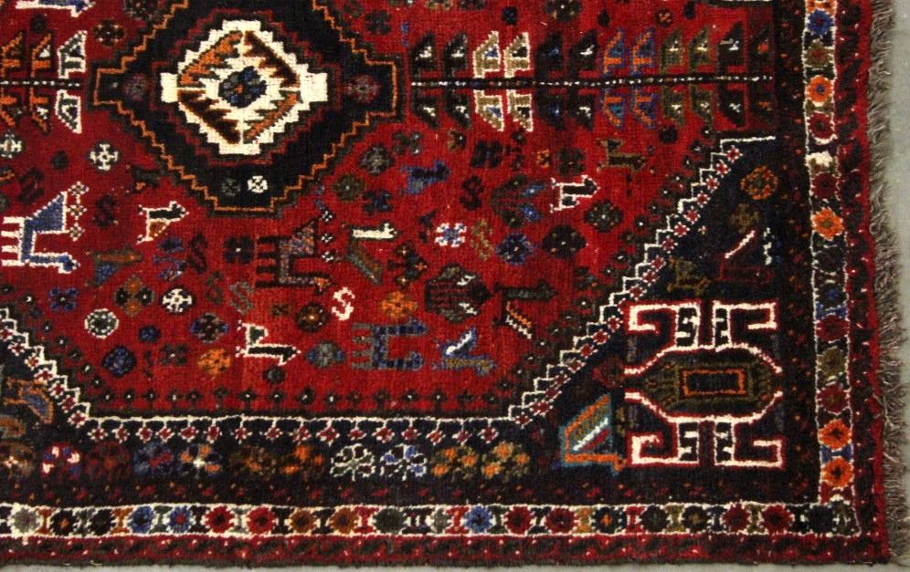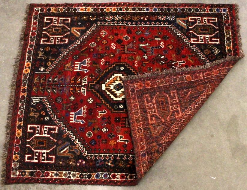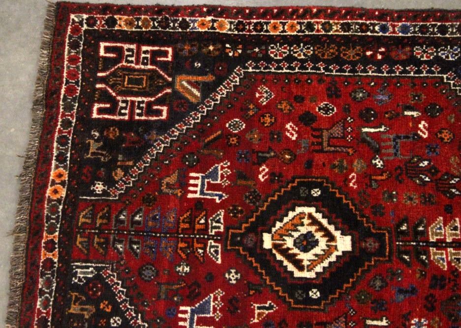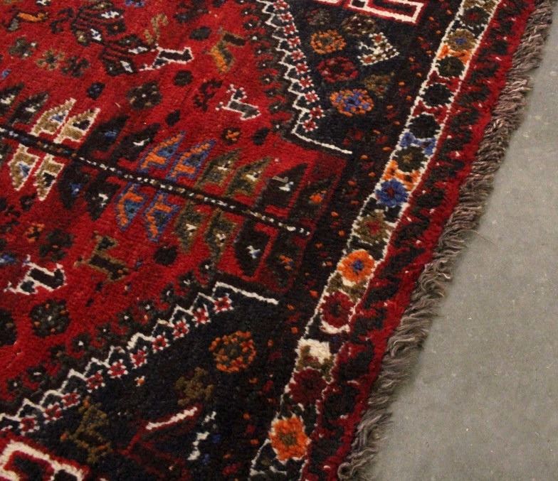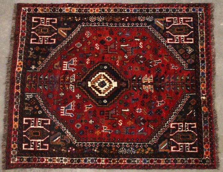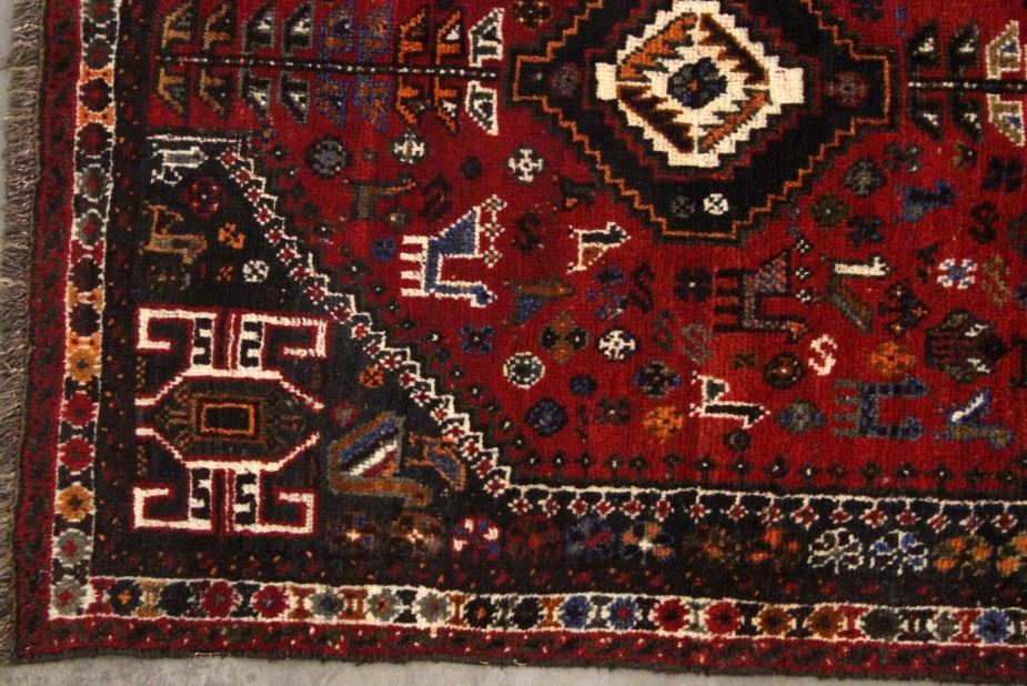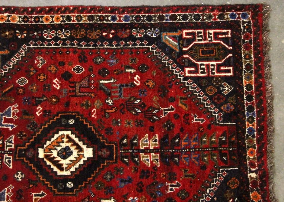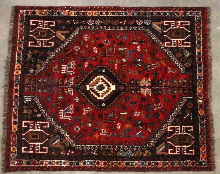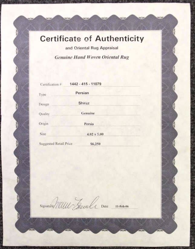 This hand woven Shiraz design Persian rug comes with a certificate of authenticity. It is a ornately design rug that brings a certain warm feel to the room. The weave is tight and it has a leather backing along the edge. It is in good condition for its age. It was previously appraised at $6250. It measures 50" W x 60" L