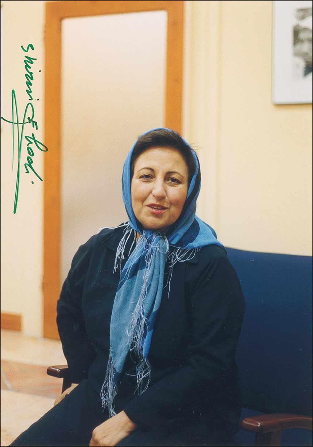 Nobel Peace Prize recipient in 2003. Color glossy 6 x 8.5 photo, signed vertically in green felt tip. In very fine condition.